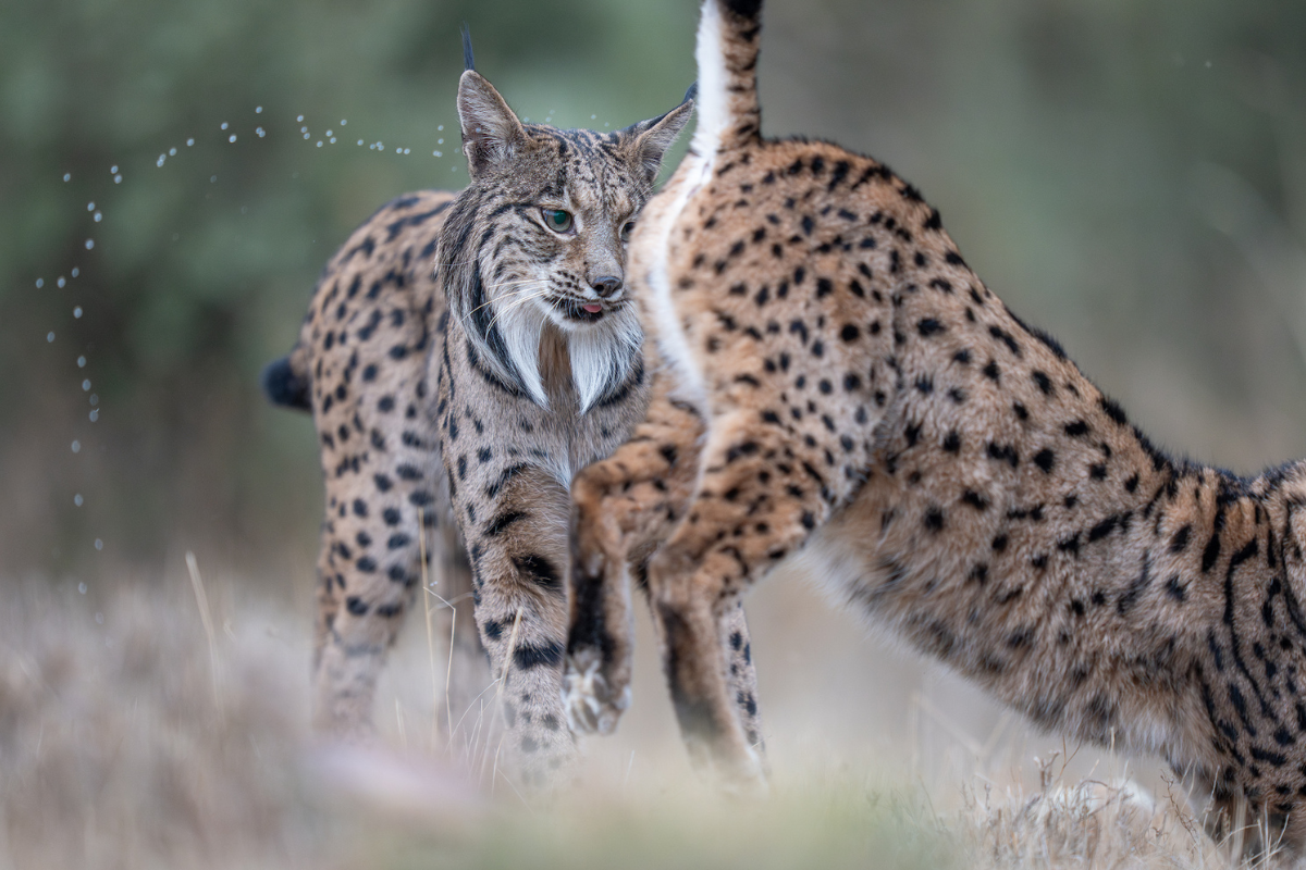 Photo 6. Parade nuptiale du lynx ibérique. La femelle (à droite) urine devant le mâle pour manifester son intérêt, mais aussi pour détourner son attention de son petit, presque adulte, qu’il pourrait facilement tuer s’il n’est pas le père.