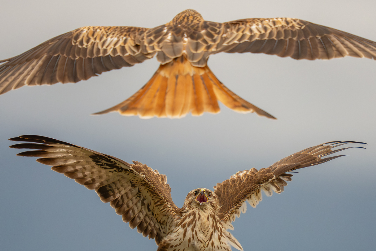 Photo 5. Le Milan royal (ci-dessus) et la Buse variable (ci-dessous) sont en compétition pour la nourriture si, comme ici, un animal mort est disponible.